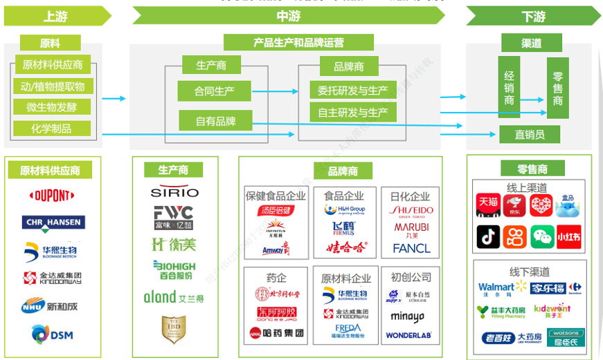 節(jié)點財經(jīng)了解到,從上游原料供應到中游生產(chǎn)加工再到下游渠道銷售,包括安琪酵母、白云山、金達威、無限極、仙樂健康、湯臣倍健、片仔癀等,愈來愈來多的企業(yè)參與進來。