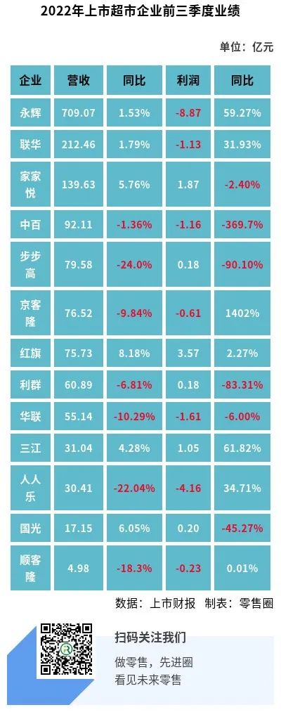 近日,沃爾瑪、大潤(rùn)發(fā)(高鑫零售)、永輝、聯(lián)華、家家悅、中百、步步高、京客隆、紅旗連鎖、利群、北京華聯(lián)、三江購(gòu)物、人人樂、國(guó)光、順客隆等零售商超發(fā)布了2022年前三季度財(cái)報(bào)。