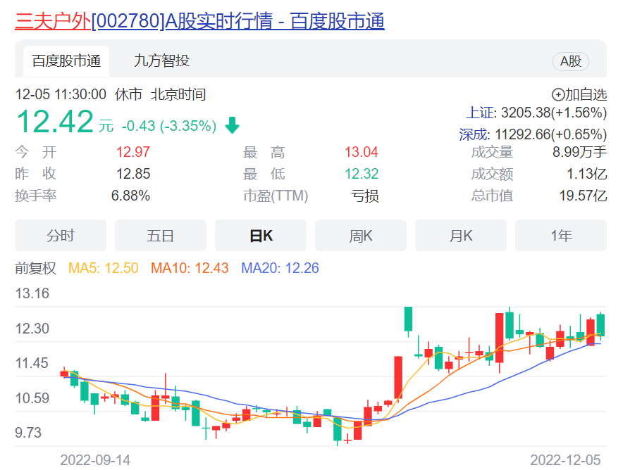 截至12月5日午間休市,三夫戶外股價報收12.42元/股,與年內高點22元/股相比,股價下降了43.59%,與歷史高點63.01元/股的高點相比,股價下滑超八成。