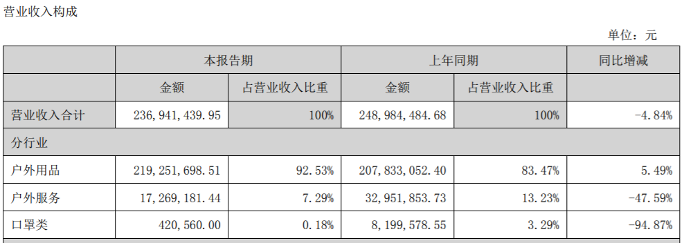 半年報顯示,三夫戶外的戶外用品實現(xiàn)營收2.193億元,營收占比92.53%;戶外服務實現(xiàn)營收1727萬元,營收占比僅為7.29%。
