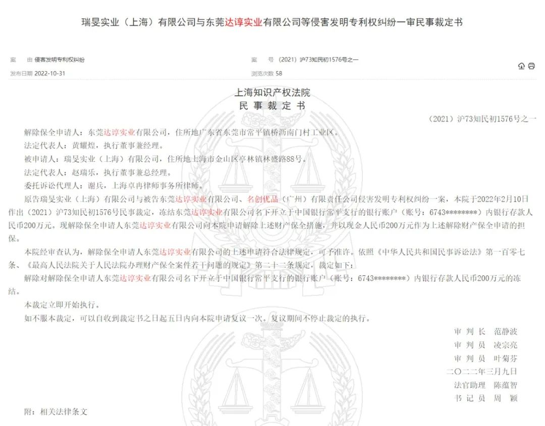 達(dá)諄實(shí)業(yè)曾對(duì)管轄權(quán)提出異議,被法院駁回。此前,瑞旻實(shí)業(yè)因此案向法院申請(qǐng)財(cái)產(chǎn)保全,法院凍結(jié)了名創(chuàng)優(yōu)品銀行存款300萬元、達(dá)諄實(shí)業(yè)銀行存款200萬元。后來,經(jīng)達(dá)諄實(shí)業(yè)申請(qǐng),法院解除其200萬元財(cái)產(chǎn)凍結(jié)。