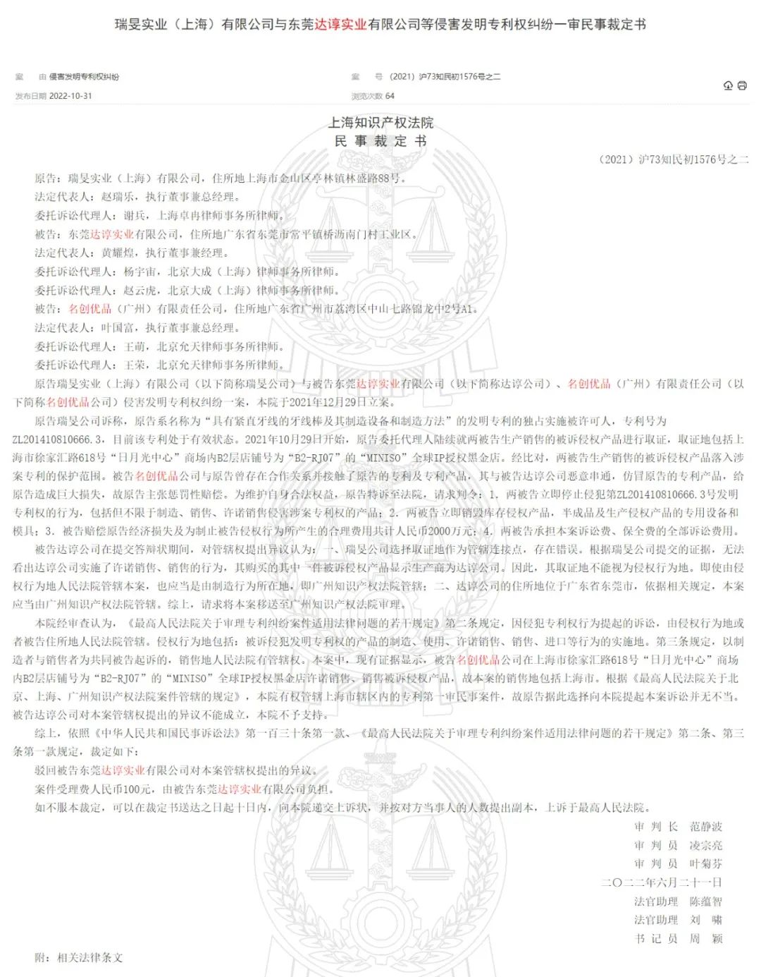 公開信息顯示,近日,瑞旻實(shí)業(yè)(上海)有限公司(簡(jiǎn)稱瑞旻實(shí)業(yè))與東莞達(dá)諄實(shí)業(yè)有限公司(簡(jiǎn)稱達(dá)諄實(shí)業(yè))、名創(chuàng)優(yōu)品(廣州)有限責(zé)任公司侵害發(fā)明專利權(quán)糾紛一審裁定書公開。瑞旻實(shí)業(yè)向法院起訴稱,其為“具有緊直牙線的牙線棒及其制造設(shè)備和制造方法”專利的獨(dú)占實(shí)施被許可人,目前,該專利處于有效狀態(tài)。名創(chuàng)優(yōu)品與公司曾存在合作關(guān)系,接觸了公司的專利及專利產(chǎn)品。名創(chuàng)優(yōu)品與達(dá)諄實(shí)業(yè)惡意串通,仿冒公司的專利產(chǎn)品。瑞旻實(shí)業(yè)請(qǐng)求法院判令名創(chuàng)優(yōu)品、達(dá)諄實(shí)業(yè)立即停止侵權(quán),并賠償公司經(jīng)濟(jì)損失及維權(quán)費(fèi)用共計(jì)2000萬元。