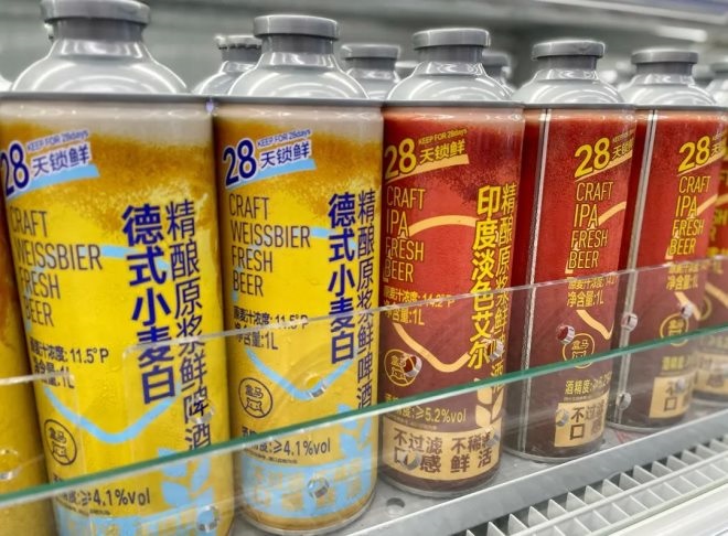 2018年盒馬推出4款精釀產(chǎn)品,2021年又推出28天鮮啤酒系列,2022年推出小眾口味古斯酸以及中高端系列大師手釀。通過自有的“商超+店中店餐飲”模式,打造燒烤、火鍋等消費(fèi)場(chǎng)景售賣啤酒。加上盒馬自身最擅長的冷鏈優(yōu)勢(shì),嚴(yán)格把控精釀啤酒的配送和保存,實(shí)現(xiàn)30分鐘送達(dá)。