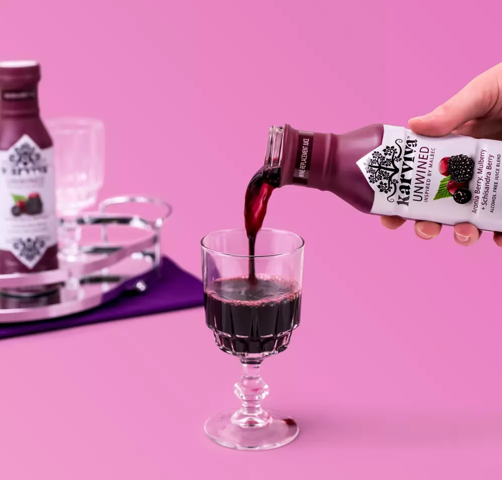 Karviva Unwined Wine Replacement Juice是一種功能性葡萄酒替代飲料,是高糖高熱量傳統(tǒng)葡萄酒的健康替代品。產(chǎn)品由桑葚,五味子,黑櫻桃和野櫻莓等漿果加工制成。盡管這款飲料沒有傳統(tǒng)的釀酒過程,但卻模擬出類似葡萄酒的絕佳口感、顏色和質(zhì)地。