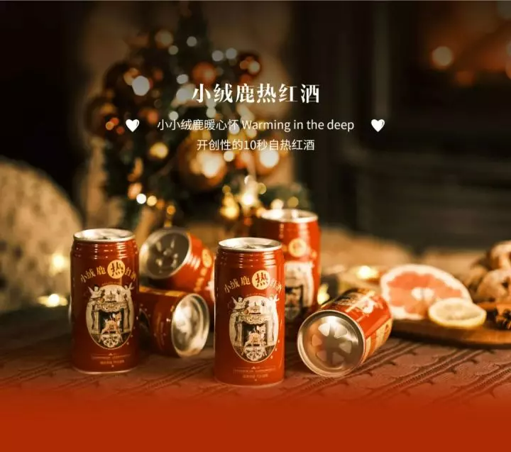 醉鵝娘推出的小絨鹿自熱罐熱紅酒則暗藏“玄機”,在室溫下,只需用力按壓瓶罐底部,搖晃瓶身,再等待1-3分鐘,便可從原先冰涼的瓶罐里喝到加熱好的熱紅酒。