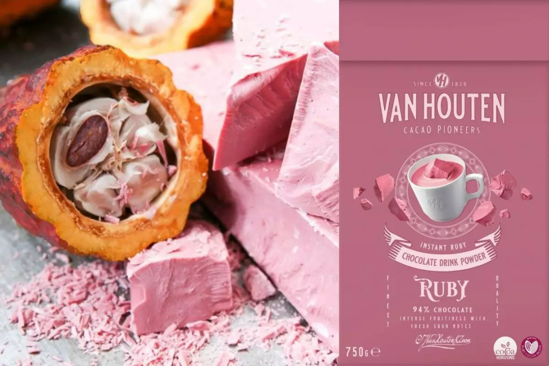 VanHouten ruby chocolate drink powder 就是一款由紅寶石巧克力制成的新型巧克力固體飲料。該產(chǎn)品由 100% 可持續(xù)的可可豆制成,具有紅寶石巧克力的所有味道和顏色,并且粉末很容易溶解在任何類型的牛奶中,帶來溫暖甜美的粉色熱巧享受。