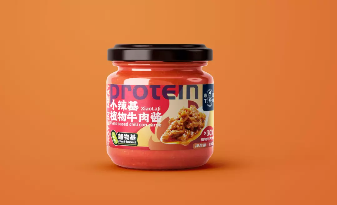 庖丁造肉推出的小辣基植物牛肉醬是一款區(qū)別于傳統(tǒng)的新式辣醬。產(chǎn)品通體呈紅色,令人即刻聯(lián)想到鮮辣刺激的口感。其中的“牛肉!笔且源蠖沟鞍缀突鹇槿实鞍诪橹饕希Y(jié)合拉絲蛋白技術(shù)和生物酶風味改良技術(shù)制成。辣醬則是以不少于30%的高蛋白的植物牛肉碎,與多種辣椒和香蒜炒制而成,蒜蓉鮮辣帶勁,肉塊粒粒分明,鮮香十足,解鎖多樣食用場景。