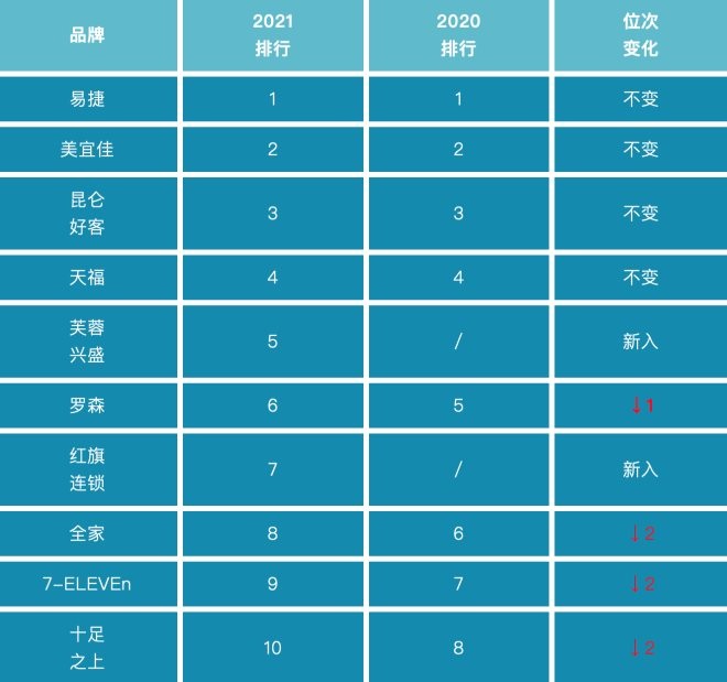 中石化易捷、美宜佳、中石油昆侖好客、天福、芙蓉興盛、羅森、紅旗連鎖、全家FamilyMart、7-ELEVEn、十足(含十足集團(tuán)之上品牌)位列前十位。