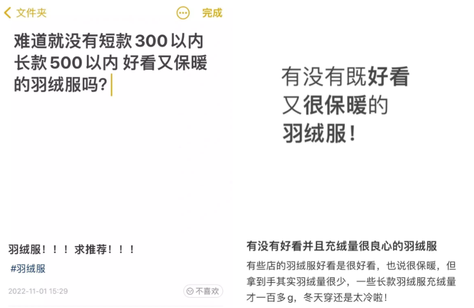 她的心理價(jià)位是2000元左右,目標(biāo)是買(mǎi)到一件兼顧保暖和好看的品牌經(jīng)典款。然而,在種草平臺(tái)上被推薦最多的那些品牌,還是大大超出了她的預(yù)期。
