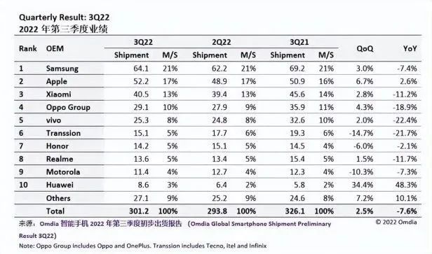 市場研究機構(gòu)Omdia公布的全球手機品牌銷量榜顯示,2022年第二、三季度全球手機銷量榜前十名中,除蘋果、三星外,其余8席均被中國品牌攬入懷中,小米、OPPO、vivo、榮耀、Realme、華為等均榜上有名。