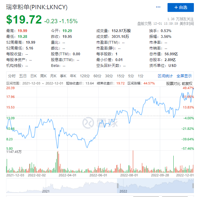 不過Q3漂亮的財務數(shù)據(jù),使得瑞幸咖啡在粉單市場的股價連連高升,不斷突破最高價。截至發(fā)文日,最新股價達19.72美元每股。
