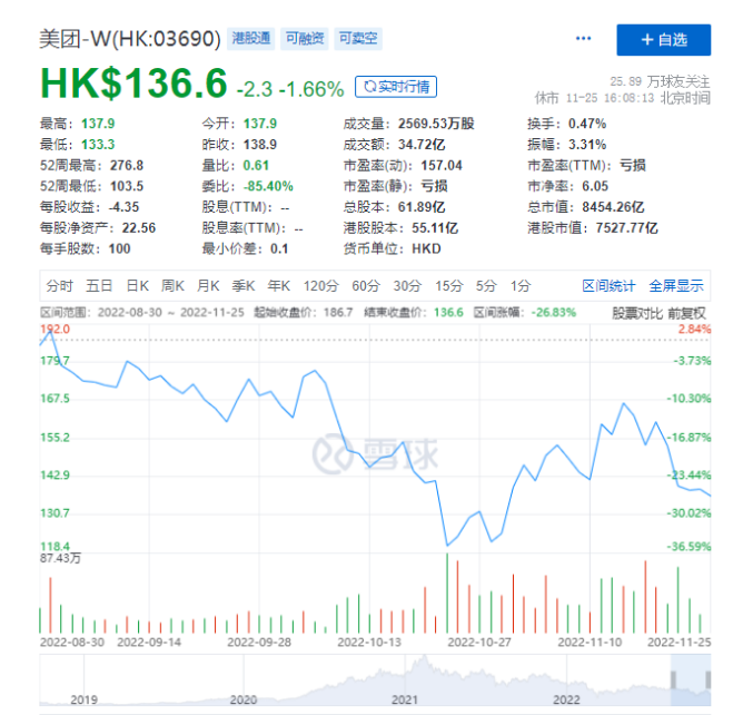 此消息一出,美團股價應聲下跌。截至11月25日,美團-W股價(港交所:03690)為136.6港元每股,在11天內(nèi)股價下跌近16%。