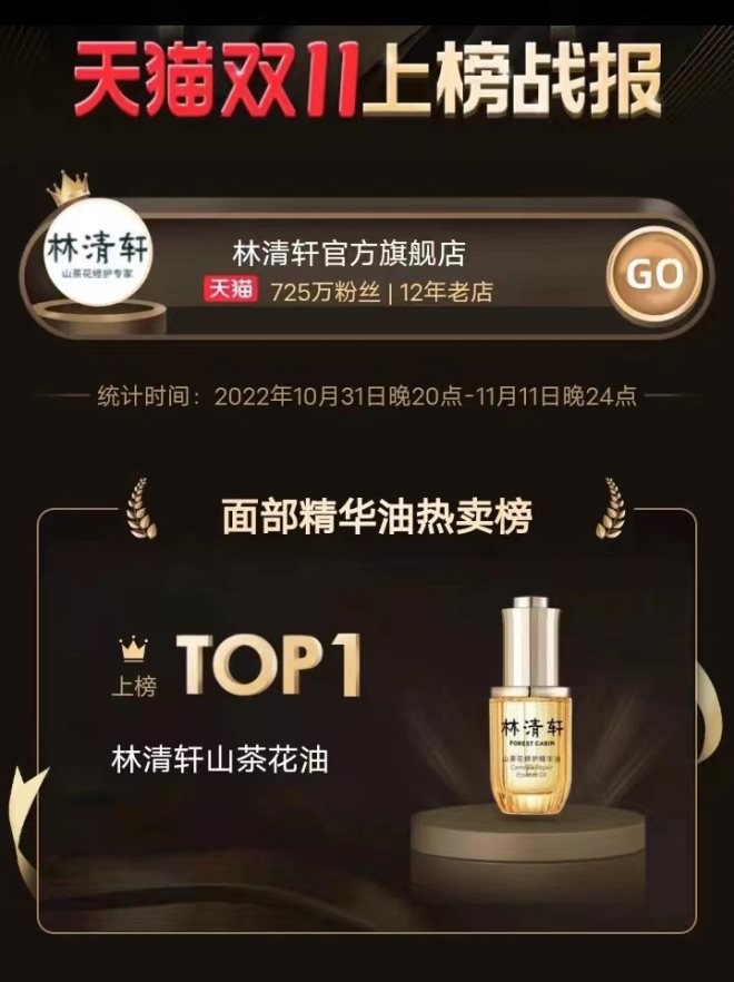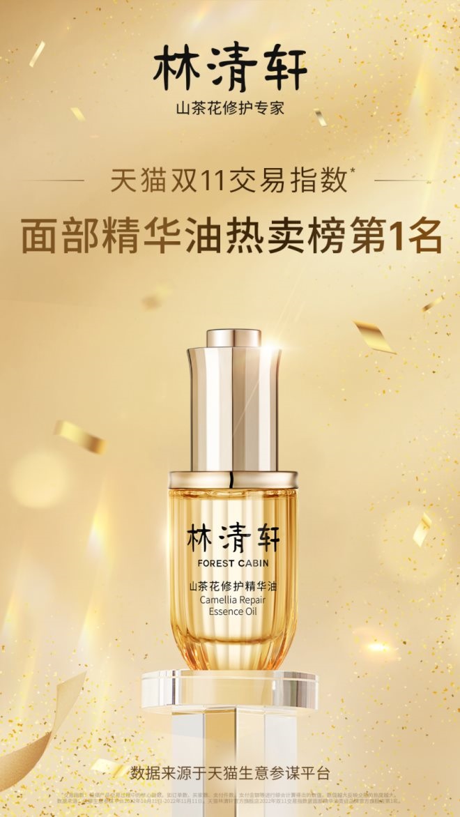 林清軒山茶花精華油榮登天貓雙11“面部精華油熱賣榜第1”