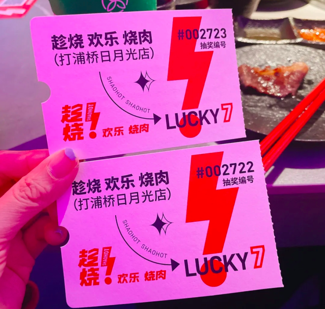 據(jù)悉,在趁燒,每日七點(diǎn)到九點(diǎn),門(mén)店就會(huì)針對(duì)用餐消費(fèi)者發(fā)起“Lucky7”整點(diǎn)節(jié)目,調(diào)動(dòng)現(xiàn)場(chǎng)氛圍。