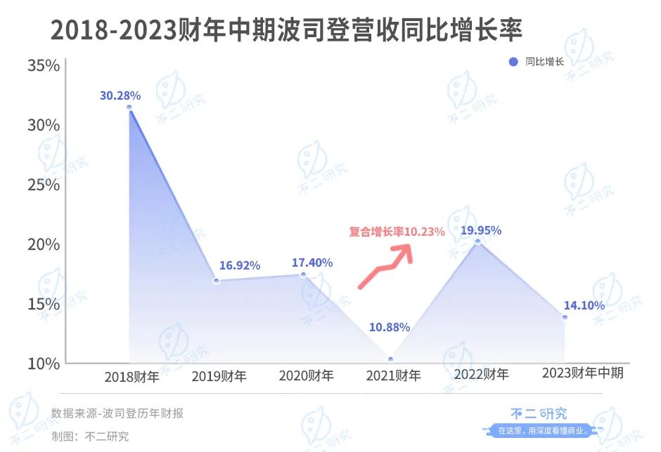 另外,波司登2023財年上半年營收增長率為14.10%,但這主要由于2022財年的低基數(shù)。2020財年上半年至2022財年上半年營收的復(fù)合增長率為10.23%,亦遠(yuǎn)低于2019財年上半年的營收增長率。