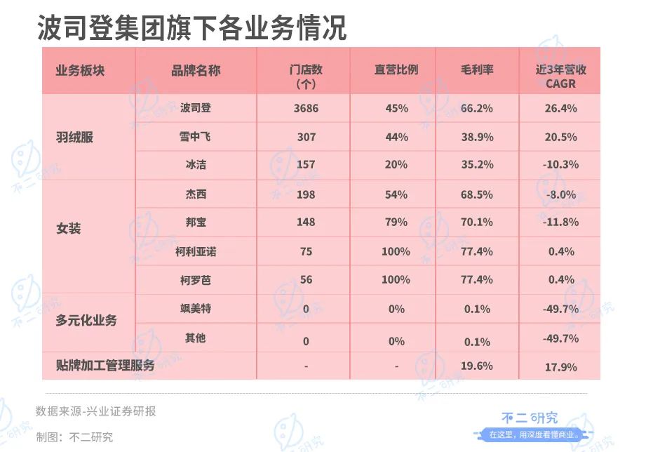 2017年底,波司登痛下決心,砍掉大多數(shù)非羽絨服項目,回歸羽絨服主業(yè)。據(jù)興業(yè)證券整理,目前波司登已剔除大部分非羽絨項目,僅留存部分高毛利的中高端女裝品牌。