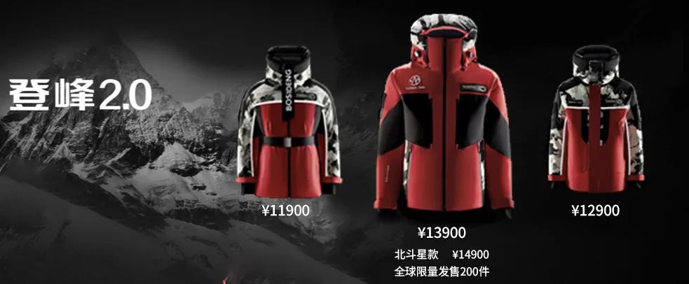 老牌國貨波司登(03998.HK)則借助“全球第一”的名號乘勢而起,推出售價14900元的“登封2.0”系列,欲在搶占高端羽絨服高地。