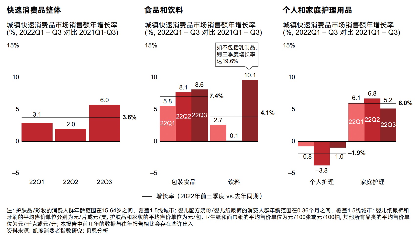 近日,貝恩公司攜手凱度消費者指數(shù)聯(lián)合發(fā)布了《2022年中國購物者報告》。報告指出,2022年前三季度中國快速消費品市場展現(xiàn)出強勁韌性,整體銷售額較去年同期增長3.6%,扭轉(zhuǎn)2020年以來的一貫趨勢,跑贏了第二和第三季度的全國GDP增速。