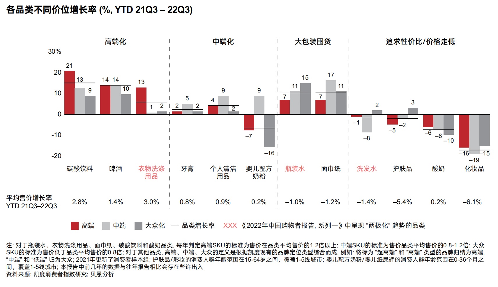 高端化:碳酸飲料和啤酒品類進一步延續(xù)高端化趨勢。衣物洗滌用品此前呈“兩極化”發(fā)展態(tài)勢,不過此次高端細分增勢迅猛,價格同比增長13%,而中端和大眾細分的增長則陷入停滯。