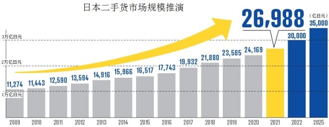 本文側(cè)重關(guān)注其中的二手貨市場,2021年,日本二手貨市場銷售規(guī)模達到2萬6988億日元,同比增長11.7%,2022年預計達到3萬億日元,其中二手服裝飾品是最活躍因素。