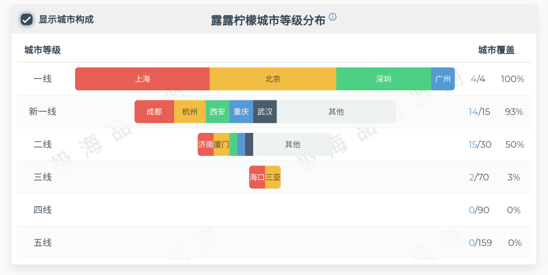 根據(jù)極海品牌監(jiān)測的數(shù)據(jù),截至12月12日,Lululemon在中國市場除了一線和新一線城市,也布局了50%的二線城市和3%的三線城市。