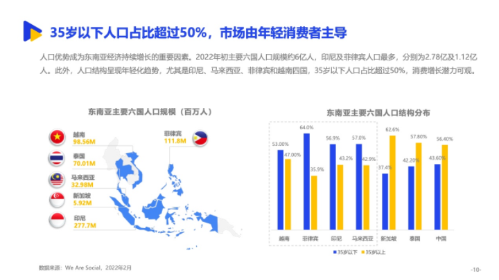 除此之外,東南亞的人口結(jié)構(gòu)呈現(xiàn)年輕化趨勢(shì),35歲以下人口占比超過50%,消費(fèi)市場(chǎng)由年輕人主導(dǎo),而年輕人多的地方,往往消費(fèi)更加旺盛。