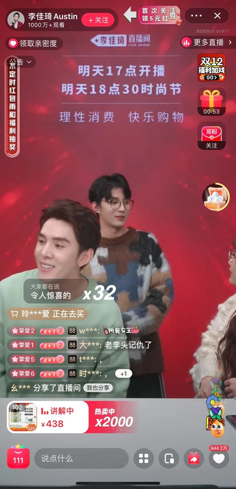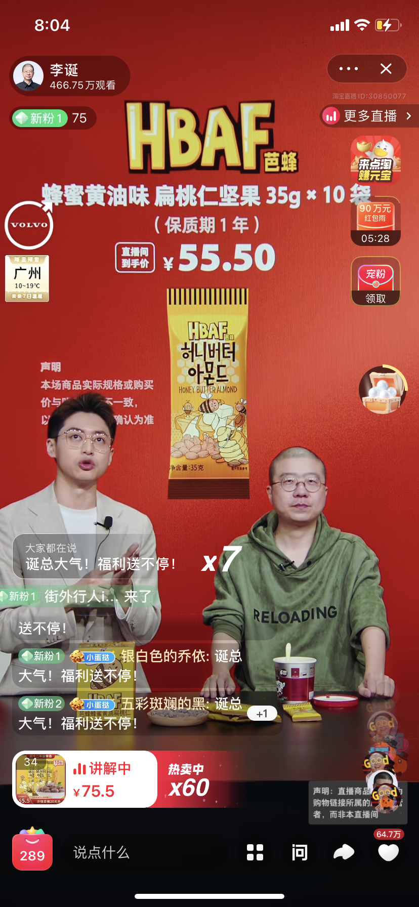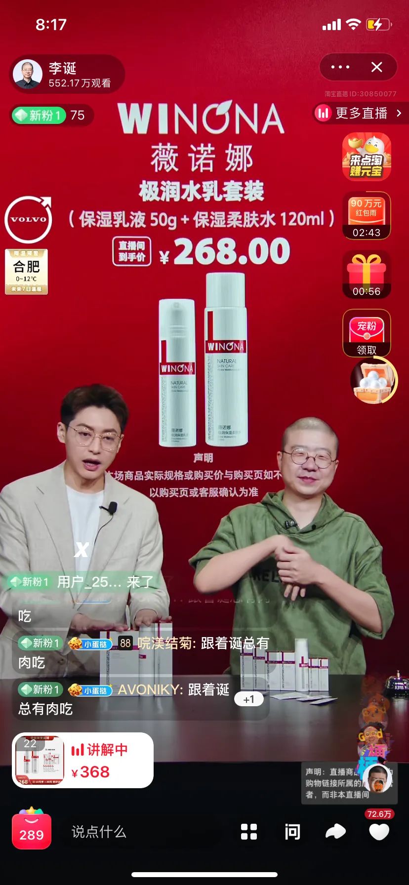 12月10日晚上,李誕7點鐘現(xiàn)身直播間,先從外場介紹沃爾沃汽車開始,然后到內場,開始介紹各種類別的商品。直播間5分鐘之內就達到了4萬人,到接近11點的時候,觀看人數(shù)早已過千萬。
