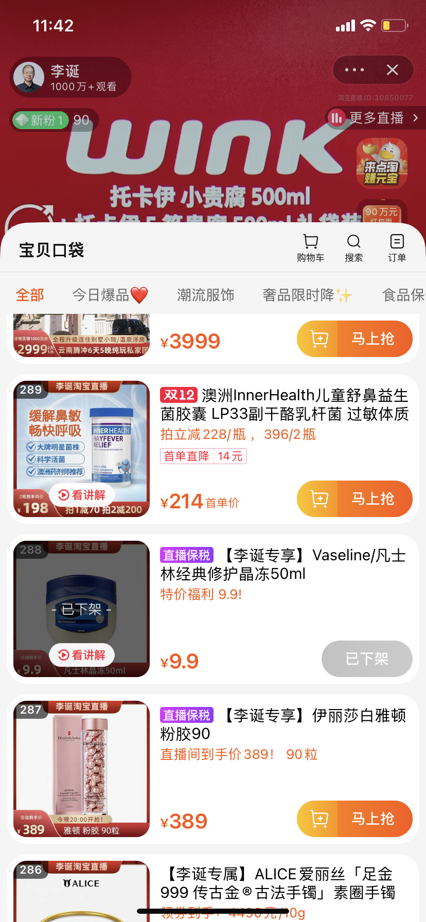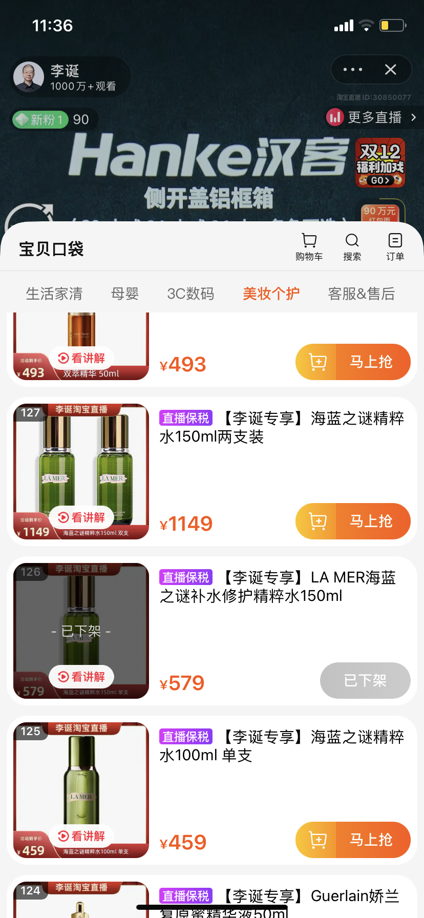 李誕直播間里的美妝品牌,多是海藍之謎、赫蓮娜、雅詩蘭黛、資生堂等國際大牌。不過在直播過程中,只有蘭蔻菁純眼霜、海藍之謎修護精萃水、凡士林修護晶凍是直接售罄的。