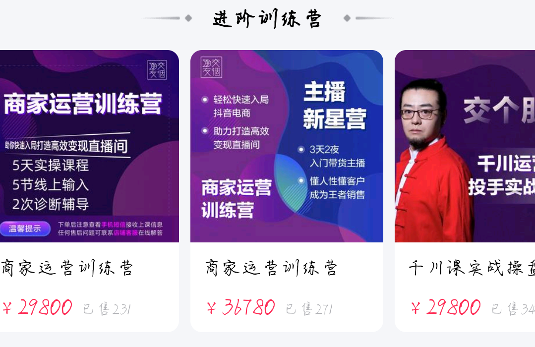 而“交個(gè)朋友之電商學(xué)苑”也交出了不錯(cuò)的成績(jī)單。剛開(kāi)始賬號(hào)上架了5個(gè)商品,為不同檔位和分類的帶貨課程,主要面向新人帶貨主播和商家,有2980的“主播新星營(yíng)”,也有29800元和36780元的高價(jià)位課程選擇。
