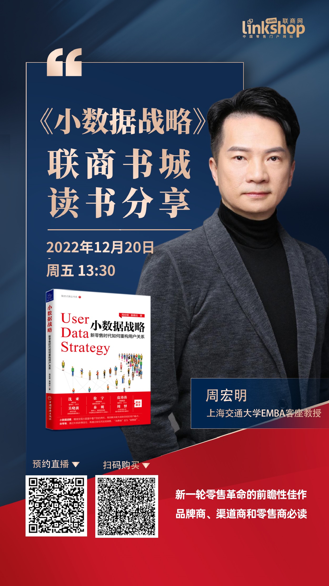12月20日下午13:30,上海交通大學(xué)EMBA客座教授周宏明先生將分享書籍《小數(shù)據(jù)戰(zhàn)略》,歡迎掃碼掃碼預(yù)約直播,如需購(gòu)買書籍也可直接掃描購(gòu)買鏈接購(gòu)買!