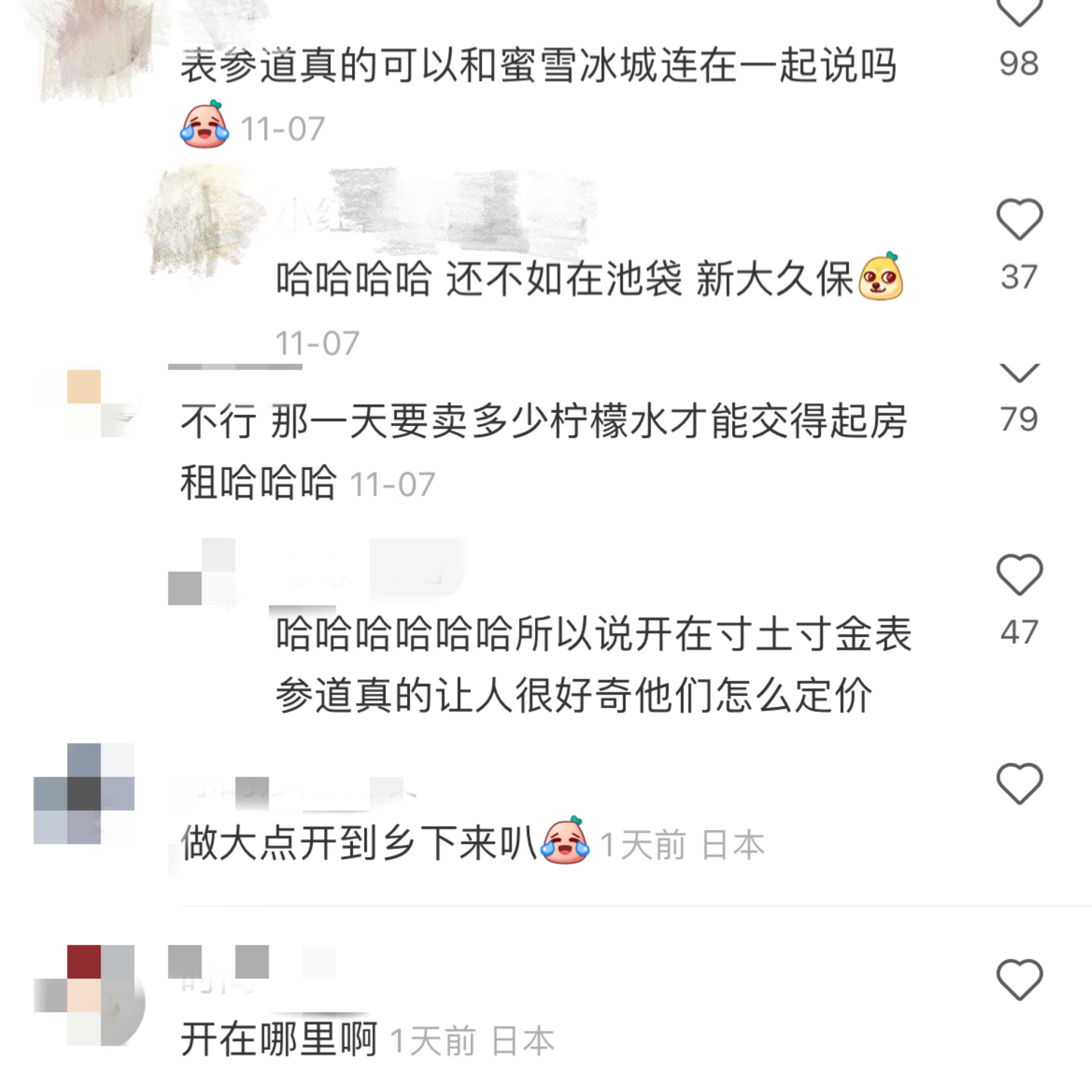 對于這則完美融入日式“中二”氣質(zhì)的官宣,網(wǎng)友們的反應(yīng)卻幾乎全部集中到了表參道這個選址上:“蜜雪冰城真的可以和表參道連在一起說嗎”、“開在表參道還能是那個我們喝得起的蜜雪冰城嗎”、“表參道?!蜜雪冰城瘋了”等等。