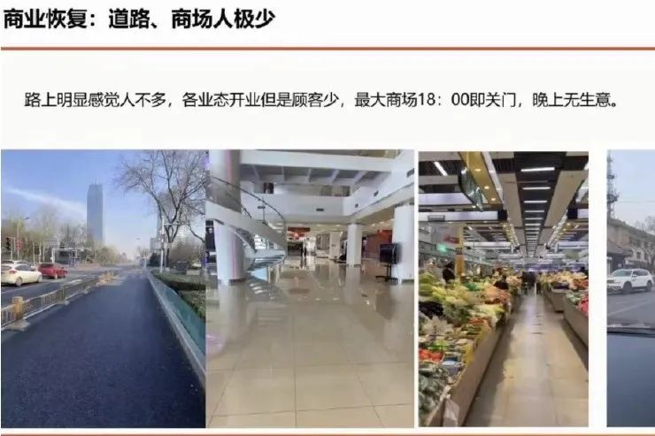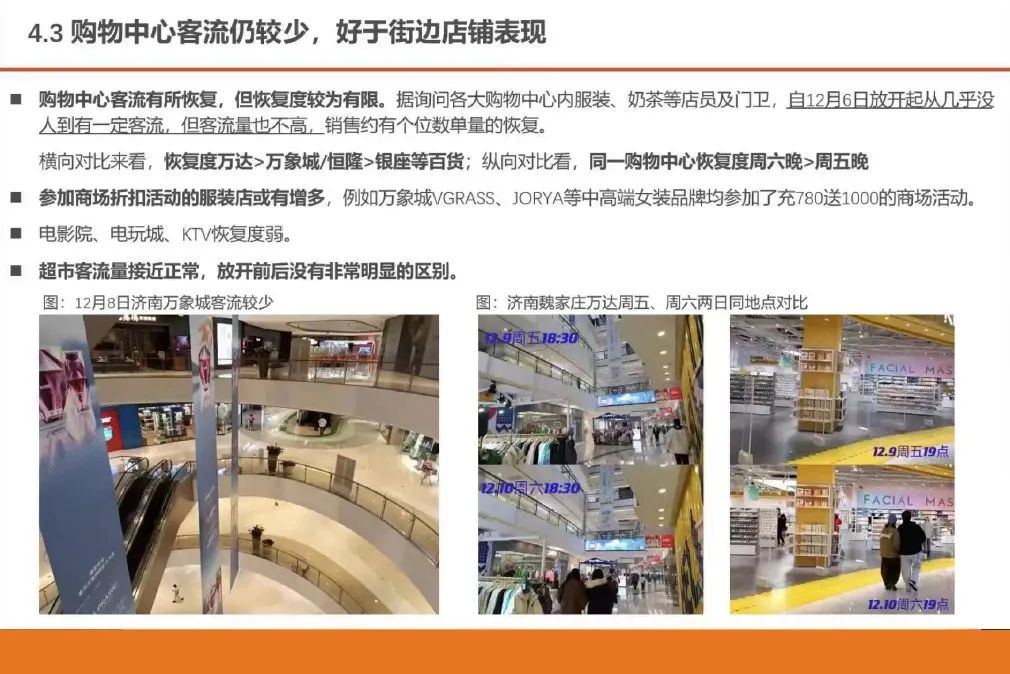 濟(jì)南在放開之后有了恢復(fù),但也相對較慢。政策轉(zhuǎn)向之前,購物中心處于幾乎無人狀態(tài),12月6日之后開始有一定人流,零售銷售量增長為個(gè)位數(shù)。