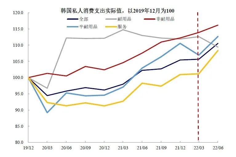 韓國在2021年11月首次直接大幅放開之后,居民們反而由于自我避險(xiǎn),導(dǎo)致活動(dòng)指數(shù)下行;而在之后經(jīng)歷了奧米克戎入侵,于2022年4月第二次直接大幅放開時(shí),居民們的避險(xiǎn)趨勢減弱了,今年二季度消費(fèi)也加快了上升。