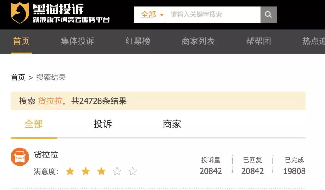 長期以來,平臺會員制度和抽傭政策的嚴(yán)苛,訂單計(jì)費(fèi)方式缺少統(tǒng)一標(biāo)準(zhǔn),導(dǎo)致貨車司機(jī)們收入和付出不成正比。在黑貓投訴平臺上,關(guān)于貨拉拉的投訴帖達(dá)到了2.4萬條,其中多數(shù)是來自貨車司機(jī)對平臺的投訴,包含平臺違規(guī)判定,不合理處罰、扣分等理由。