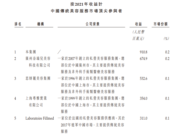 按2021年收益計(jì)算,美麗田園是中國(guó)最大的傳統(tǒng)美容服務(wù)提供商和第四大非外科手術(shù)類(lèi)醫(yī)療美容服務(wù)提供商。同時(shí),按來(lái)自直營(yíng)店傳統(tǒng)美容服務(wù)的收益計(jì),美麗田園2021年在中國(guó)也排名第一,比第二名高出2億多。
