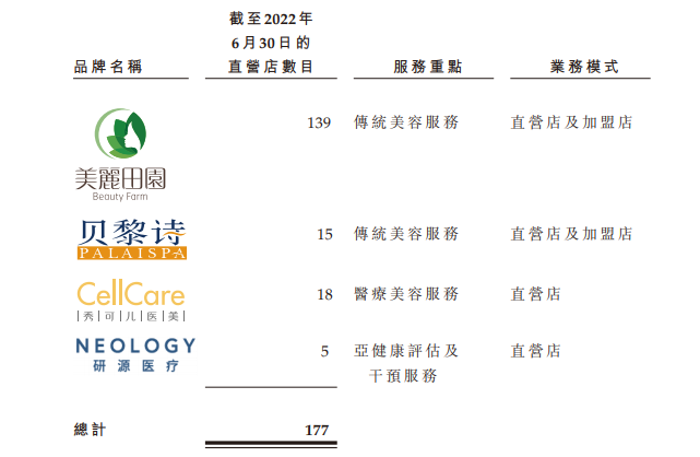 經(jīng)過(guò)近30年的發(fā)展,如今美麗田園擁有177家直營(yíng)店和175家加盟店,店鋪總數(shù)達(dá)到352家,這些門(mén)店由美麗田園、貝黎詩(shī)、研源、秀可兒四個(gè)連鎖品牌構(gòu)成,主要從事傳統(tǒng)美容和醫(yī)療美容兩大業(yè)務(wù)。