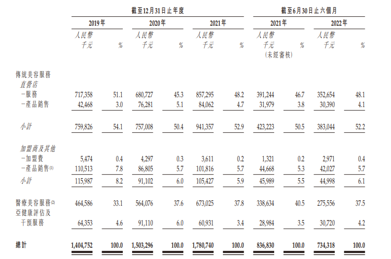 招股書(shū)顯示,美麗田園現(xiàn)擁有352家門(mén)店,3年半總收益為54億,按2021年收益計(jì)算在傳統(tǒng)美容服務(wù)行業(yè)排名第一。