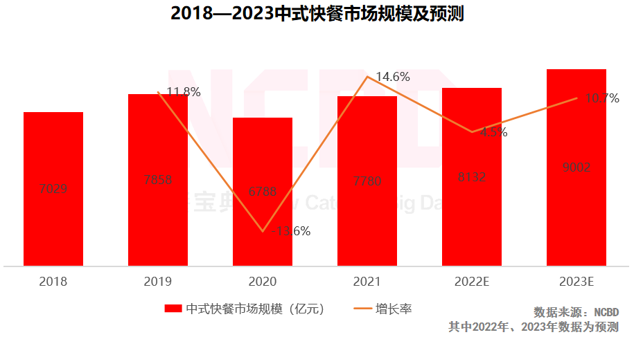 從品類選擇上講,新品牌選擇了中式快餐這樣一個接近萬億的巨大市場。中式快餐近年發(fā)展較為迅速,一些優(yōu)秀的中式快餐品牌也得到了資本的青睞。NCBD(餐寶典)的《中式快餐行業(yè)專題研究報告》顯示,2021年中式快餐市場規(guī)模達到7780億元,預計到2023年將超過9000億元。