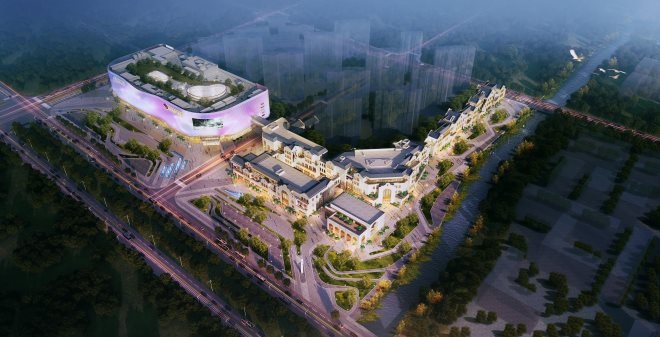 在結(jié)合青蛙山、河濱景觀帶,營(yíng)造城市維度的休閑生活方式的同時(shí),商場(chǎng)的外立面也是提取了嶺南特色建筑的肌理,結(jié)合以折線為基礎(chǔ)的變化。