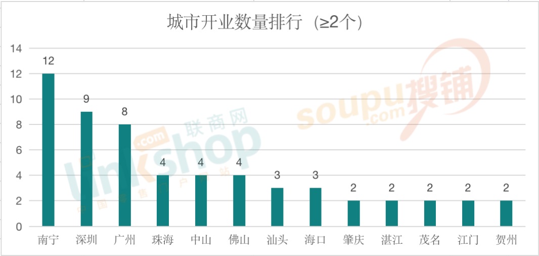從城市的活躍度上看,根據(jù)實(shí)際統(tǒng)計(jì)情況,以開(kāi)業(yè)數(shù)量≥2個(gè)為標(biāo)準(zhǔn)統(tǒng)計(jì)的城市活躍TOP13榜中,南寧以12個(gè)開(kāi)業(yè)量穩(wěn)居榜首,深圳和廣州兩大城市分別以9個(gè)和8個(gè)緊隨其后。