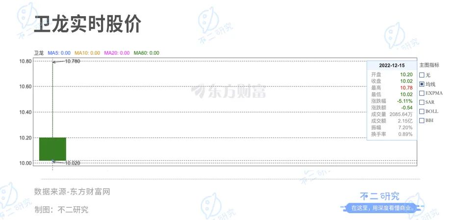 衛(wèi)龍此次IPO發(fā)行價為10.56港元/股,募資凈額為8.99億港元。上市首日,衛(wèi)龍的開盤價為10.20港元/股,較發(fā)行價下跌3.4%;截至12月15日港股收盤,衛(wèi)龍報收10.02港元/股,對應市值235.6億港元(折合人民幣211.0億元),較發(fā)行價下跌5.11%,跌超10億。