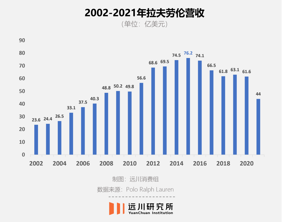 2012年,拉夫勞倫營(yíng)收達(dá)到歷史高點(diǎn)70億美元,美國(guó)運(yùn)動(dòng)員也把拉夫勞倫穿上倫敦奧運(yùn)會(huì)的賽場(chǎng),一時(shí)間風(fēng)光無兩。