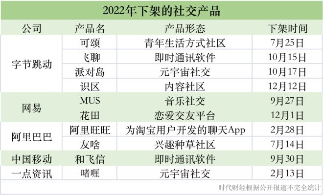 時代財經(jīng)根據(jù)公開報道不完全統(tǒng)計,年內(nèi)已有10款社交產(chǎn)品宣布下架或停運,僅字節(jié)旗下還有即時通訊軟件飛聊、種草社區(qū)可頌、元宇宙社交應(yīng)用派對島3款A(yù)pp。