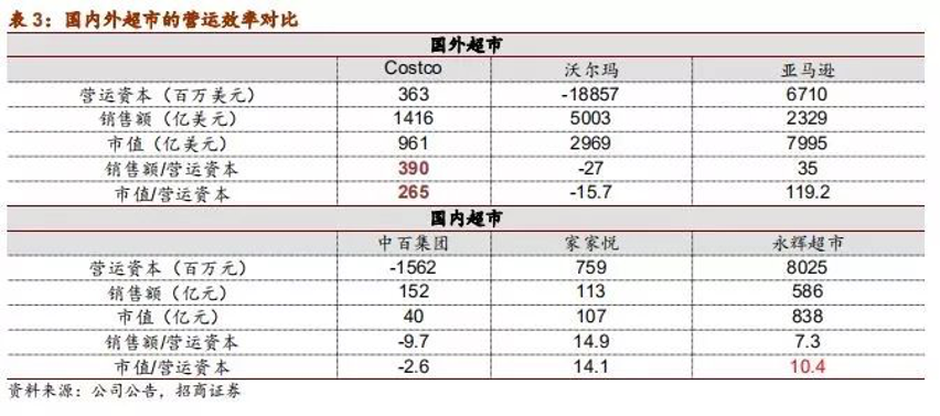 Costco的營(yíng)運(yùn)資本效率發(fā)揮至極致。與國(guó)內(nèi)外超市經(jīng)營(yíng)數(shù)據(jù)相比,Costco僅用3.63億美元支撐起1416億美元的銷售額和961億美元的市值,相比亞馬遜用67億美元運(yùn)轉(zhuǎn)2329億美元的銷售額和7995億美元的市值,Costco的營(yíng)運(yùn)資本效率發(fā)揮至極致。