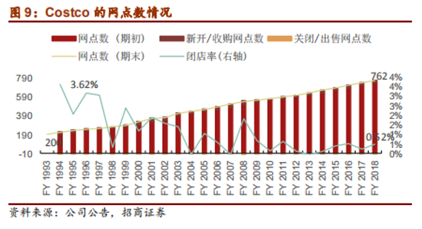 Costco閉店率下滑明顯。根據(jù)公司披露的公告,關(guān)店數(shù)量控制在合理范圍,并且每年關(guān)閉/出售的網(wǎng)點(diǎn)數(shù)占比從1994年的3.62%降低至2018年的0.52%,閉店率下滑明顯。