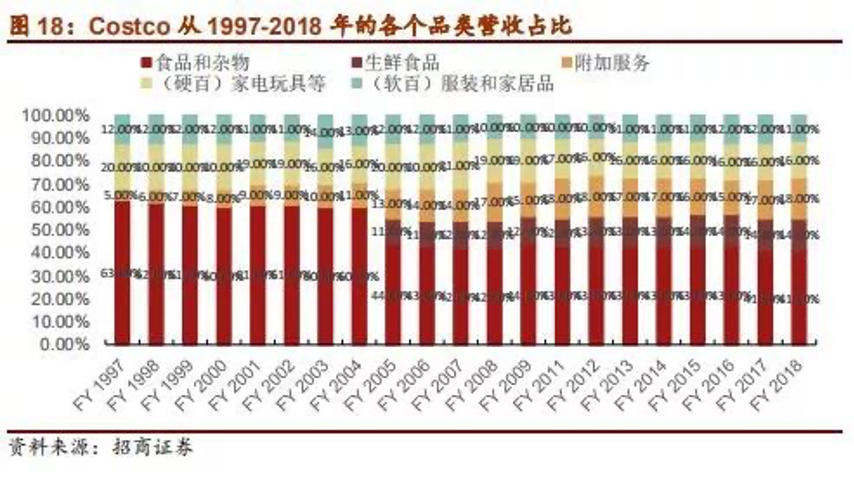 Costco在2005年生鮮占比11%,2018年生鮮占比14%,生鮮占比穩(wěn)中有升。