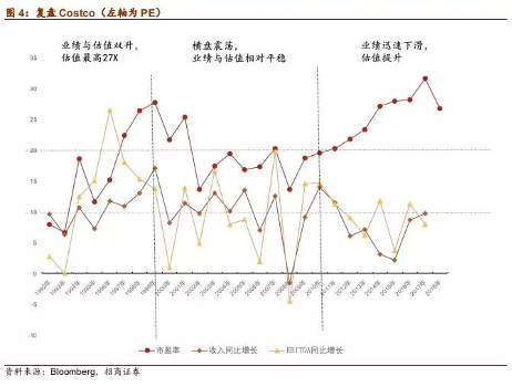 Costco股價(jià)表現(xiàn)優(yōu)于沃爾瑪。Costco的市盈率在2004年以后均優(yōu)于沃爾瑪,PE區(qū)間在15-30之間,沃爾瑪在11-22倍之間。