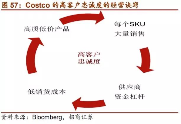 摒棄依賴后臺(tái)毛利提升自身經(jīng)營(yíng)效率。與國(guó)內(nèi)超市運(yùn)營(yíng)方式不同,Costco無(wú)租金、不向后臺(tái)供應(yīng)商收取通道費(fèi),也不賺取商品前臺(tái)進(jìn)銷差價(jià),主要運(yùn)營(yíng)重點(diǎn)在于以高性價(jià)比、自有品牌和精選SKU策略來(lái)吸引消費(fèi)者加入會(huì)員,以獲得高忠誠(chéng)度。