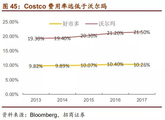 Costco的費(fèi)用率處于10%左右的水平,遠(yuǎn)低于沃爾瑪20%左右的費(fèi)用率。