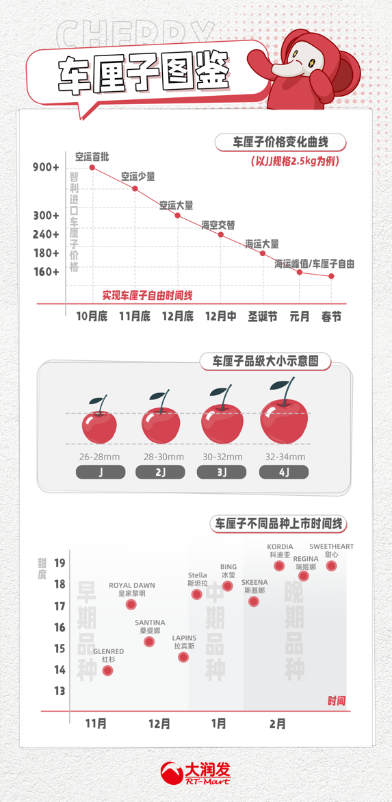 生鮮供應(yīng)鏈也做了升級(jí),從原產(chǎn)地,到空運(yùn)和海運(yùn),室溫都控制在12度以?xún)?nèi),直接進(jìn)入到大潤(rùn)發(fā)分布在全國(guó)的5個(gè)生鮮倉(cāng),再進(jìn)入門(mén)店。并對(duì)糖度和品種進(jìn)行了嚴(yán)控,比如一月份車(chē)?yán)遄觾r(jià)格下降到“車(chē)?yán)遄幼杂伞彪A段,也只選擇好吃的拉賓品種。